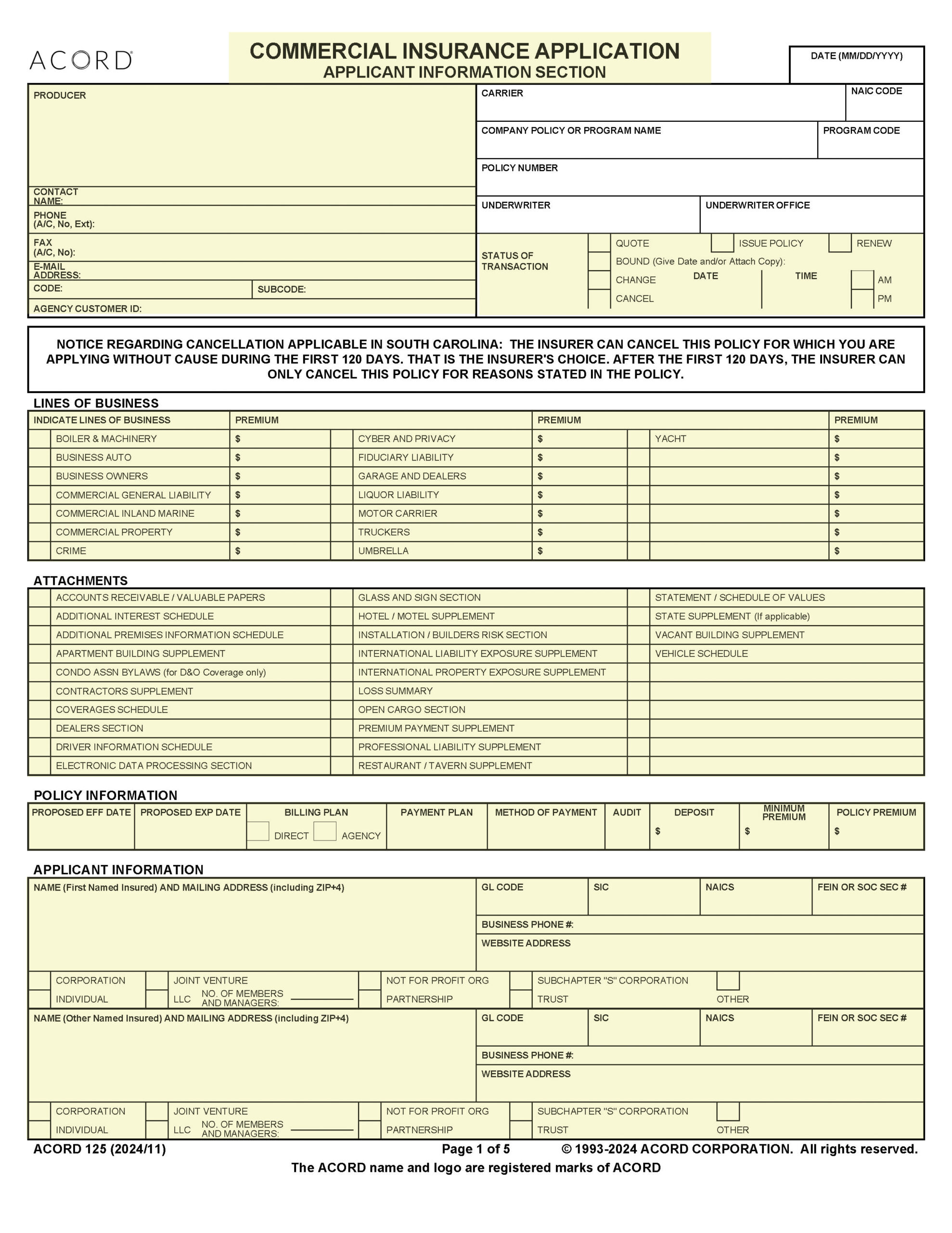 ACORD 125, Commercial Insurance Application, Applicant Information Section, is used in the underwriting process for any commercial account submission. The Applicant Information Section is the foundation on which the ACORD commercial application program is built. This form contains information that is not duplicated on other ACORD commercial application forms. The Applicant Information Section is a required part of every commercial submission except Workers Compensation and no commercial application is complete without it.