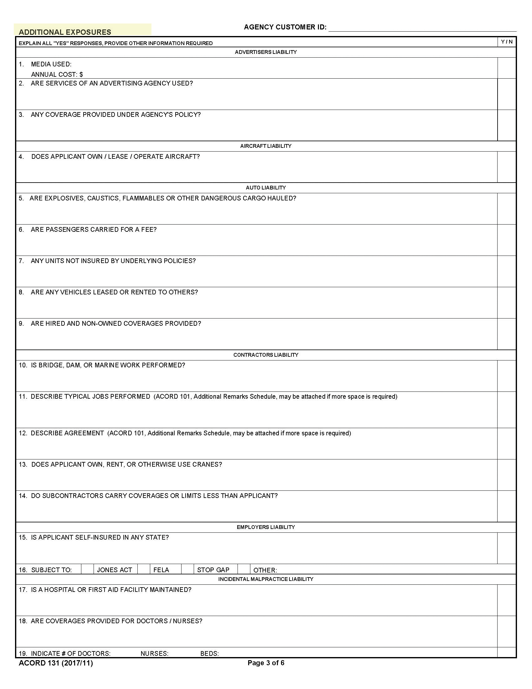 For each exposure provide the information requested. Explain all yes responses. Use the Remarks section on page 4 or use ACORD 101 if additional space is required.