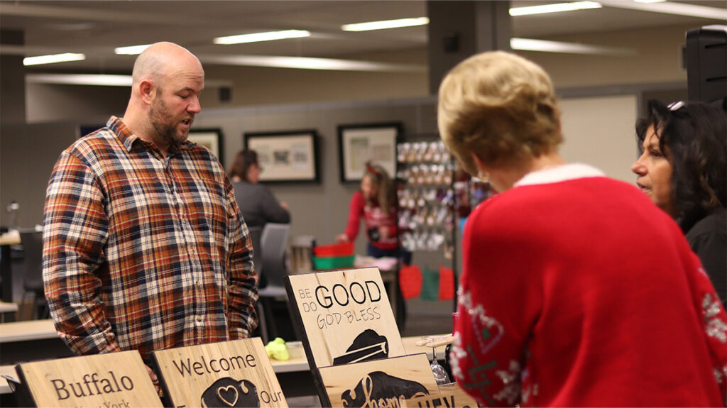 Colleagues sold & purchased jewelry, holiday decorations, hair tinsel, Mary Kay products, tumblers, tote bags, puzzles, custom wood products, knit blankets, potted plants, charms, sourdough bread, and more. At the Merchants-Dise station, colleagues could purchase company merchandise with 100% proceeds donated to United Way.