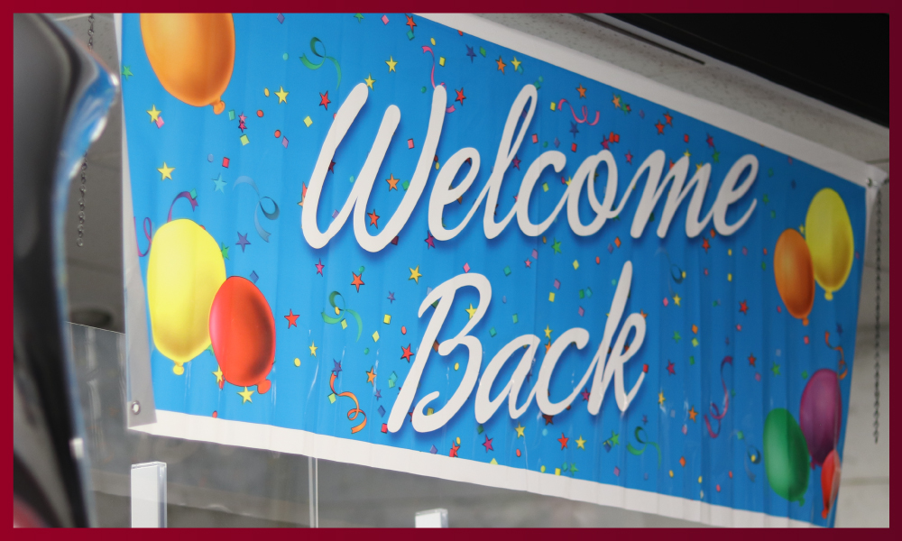 - “Welcome Back” sign hanging above the security desk at the front entrance of Merchants’ corporate headquarters.