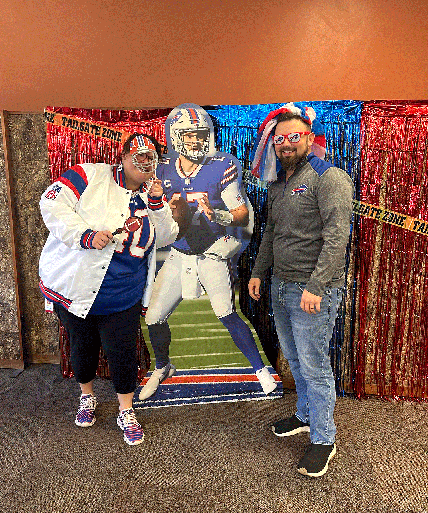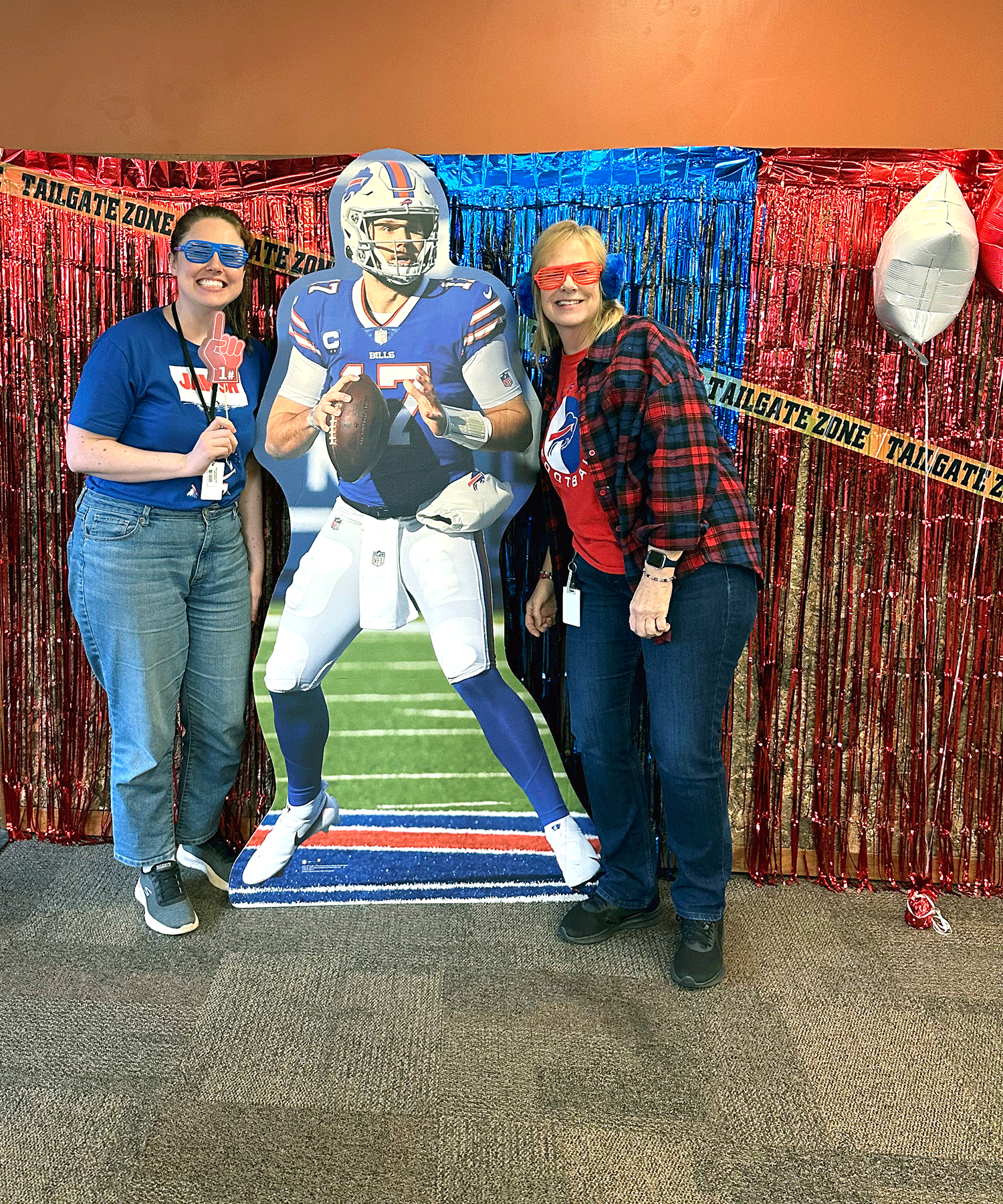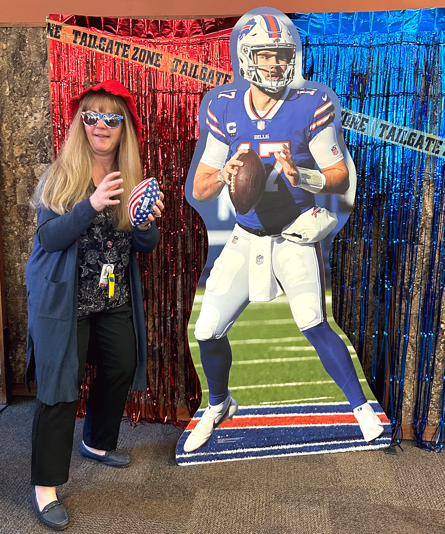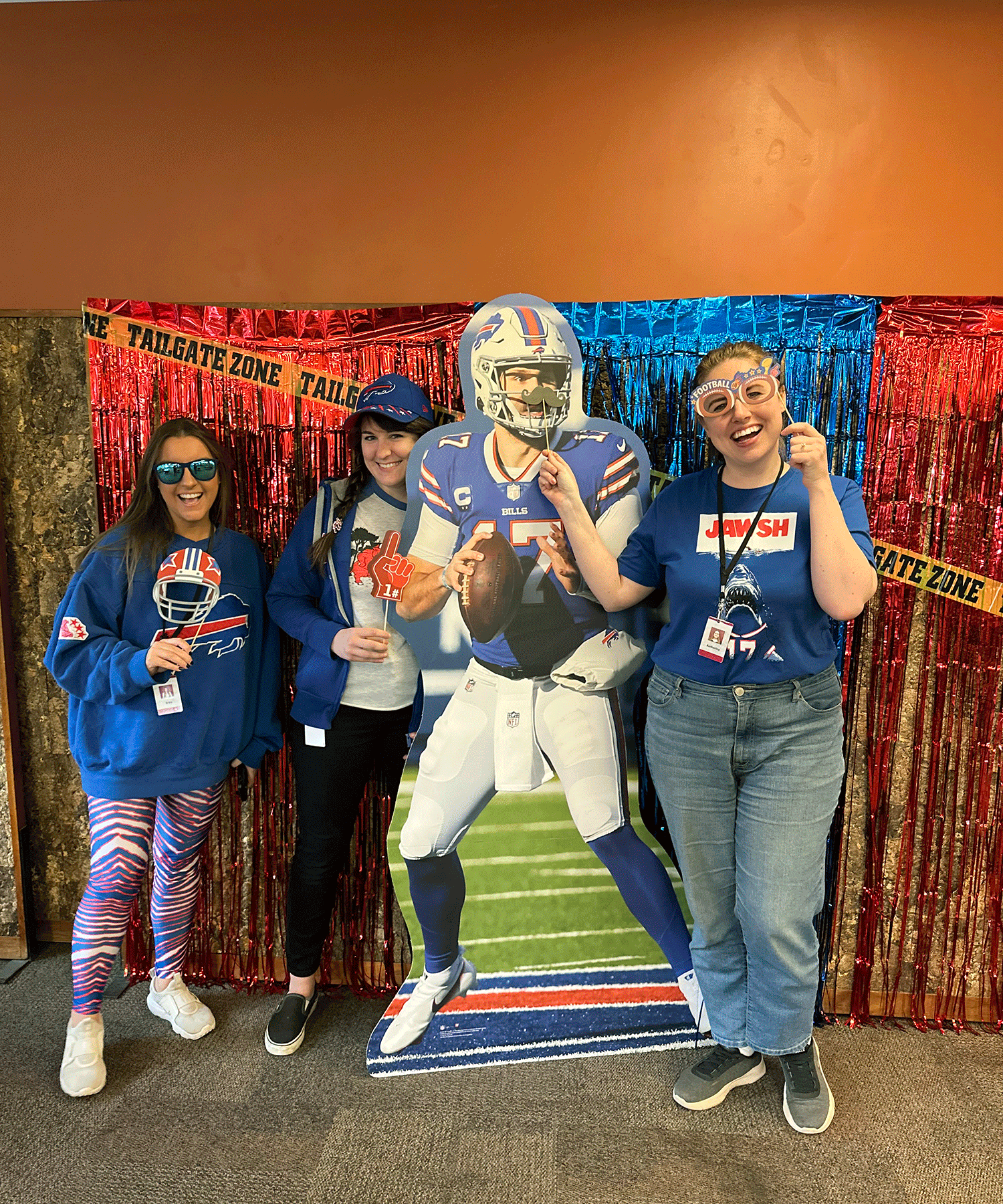 Colleagues snapped photos at the Bills-themed photo booth, complete with props and a cardboard Josh Allen!
