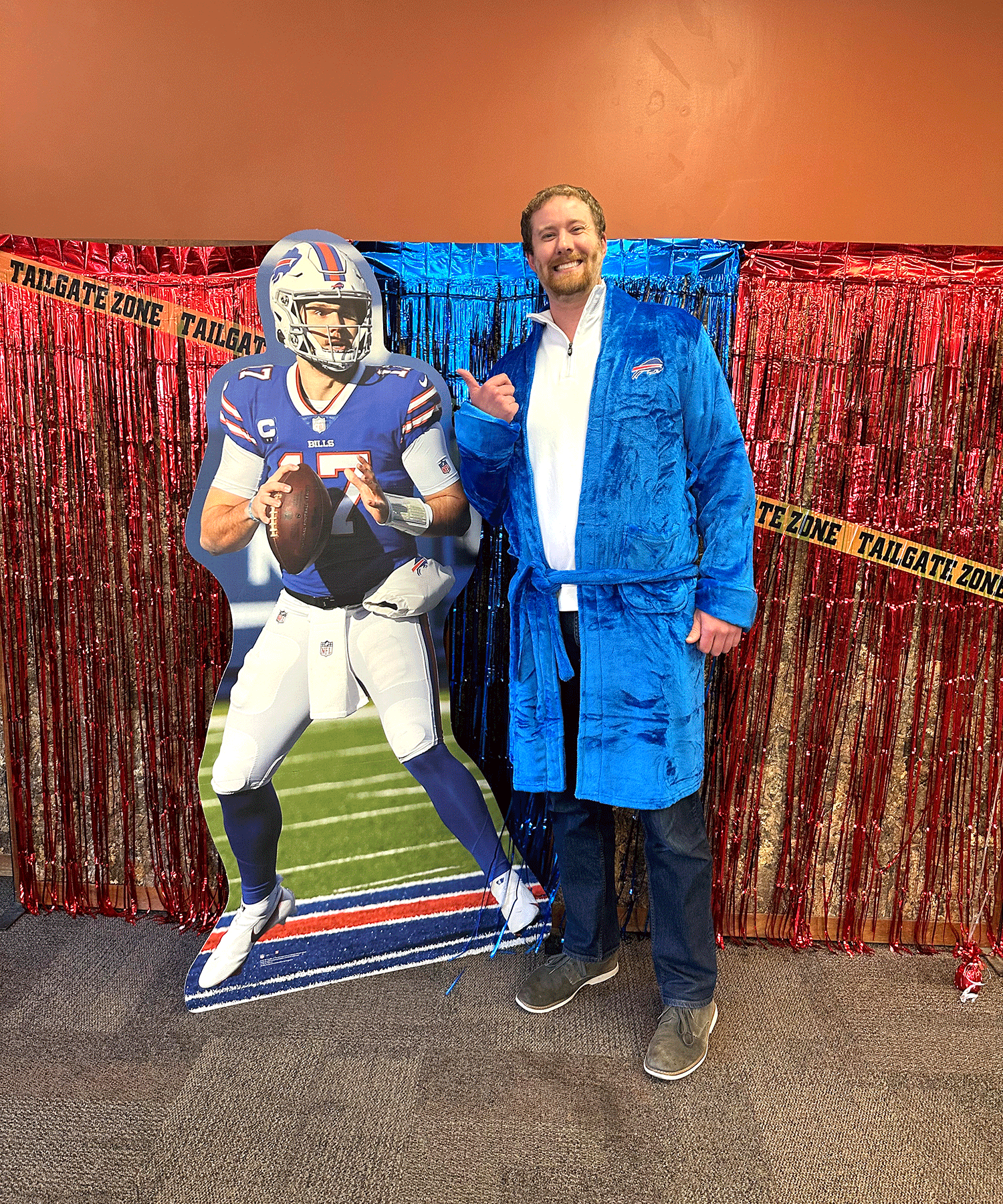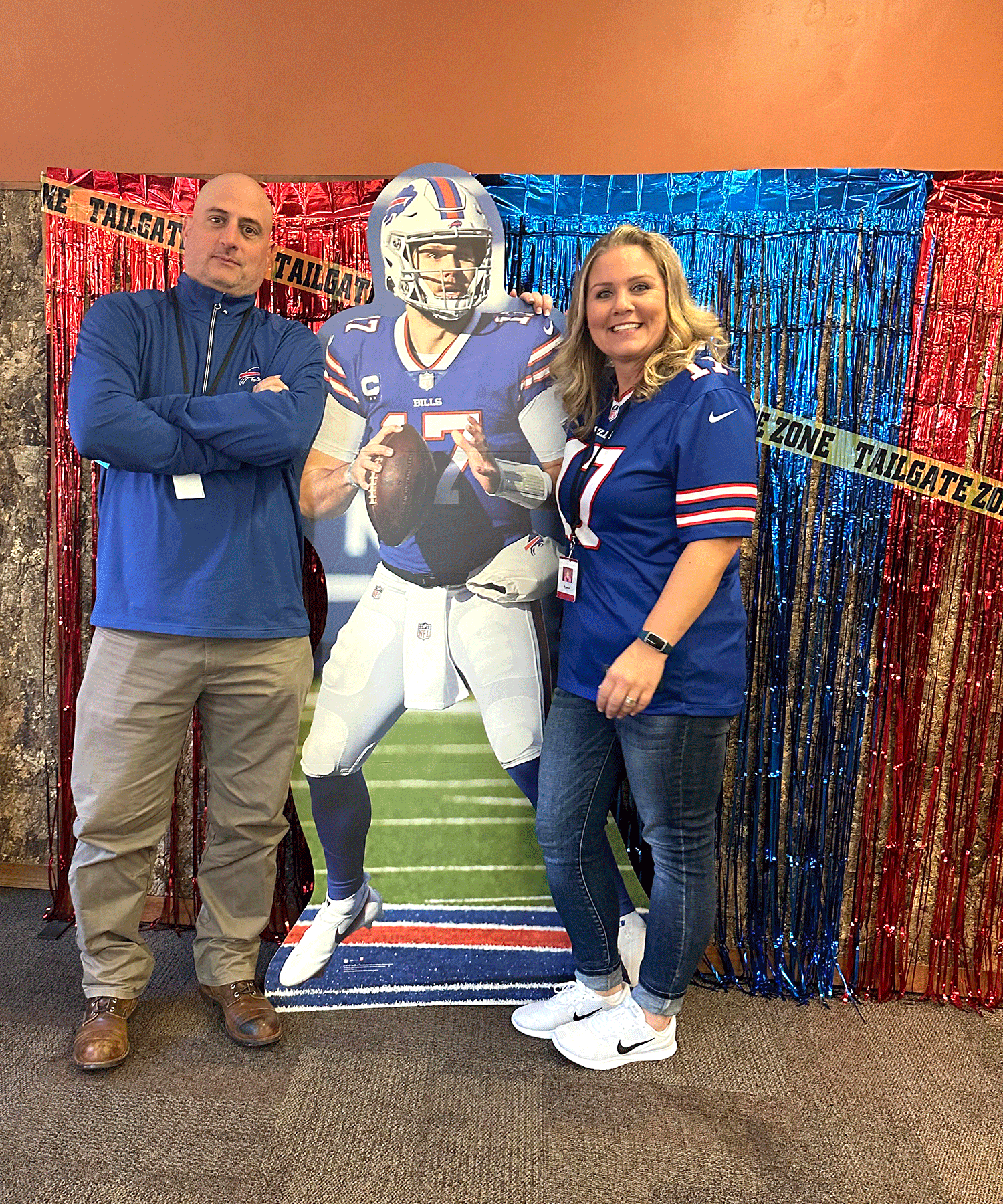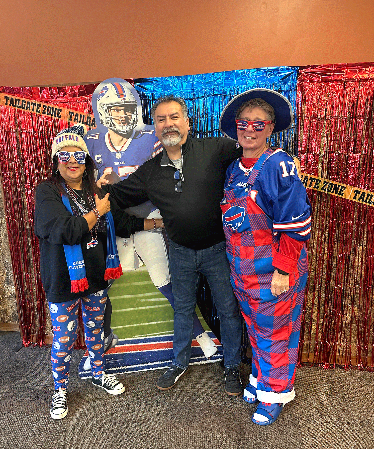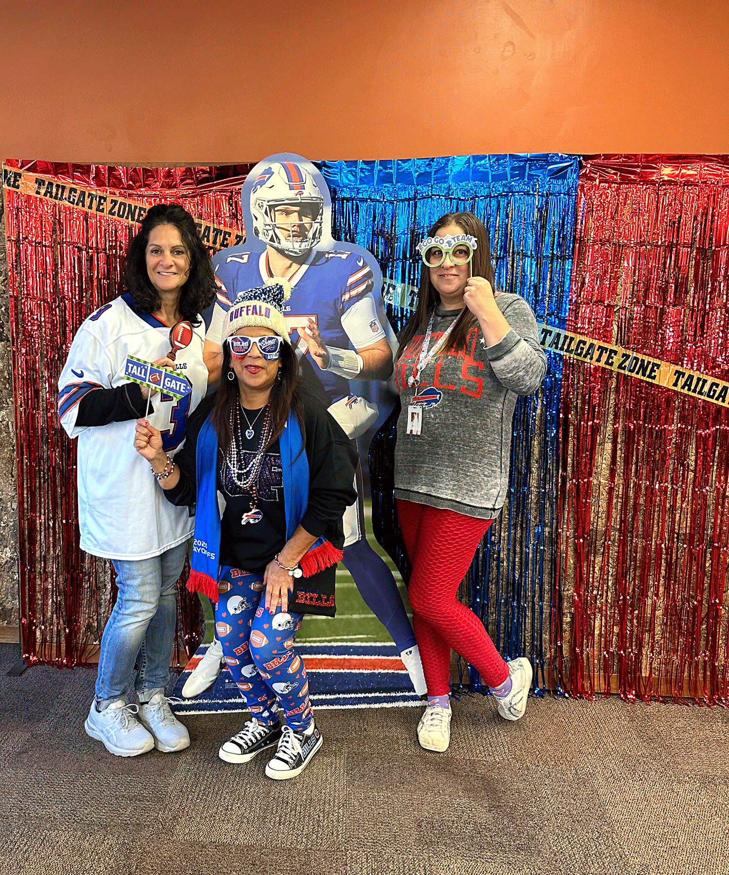 Colleagues snapped photos at the Bills-themed photo booth, complete with props and a cardboard Josh Allen!