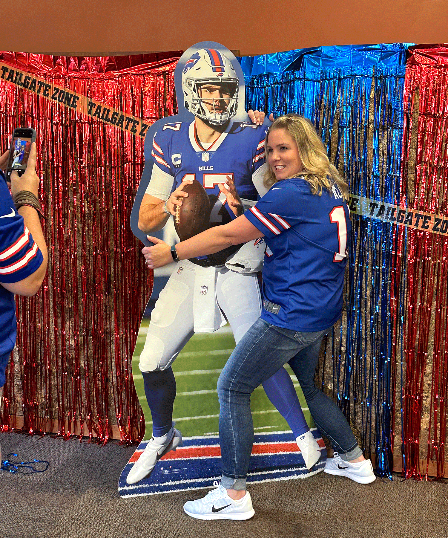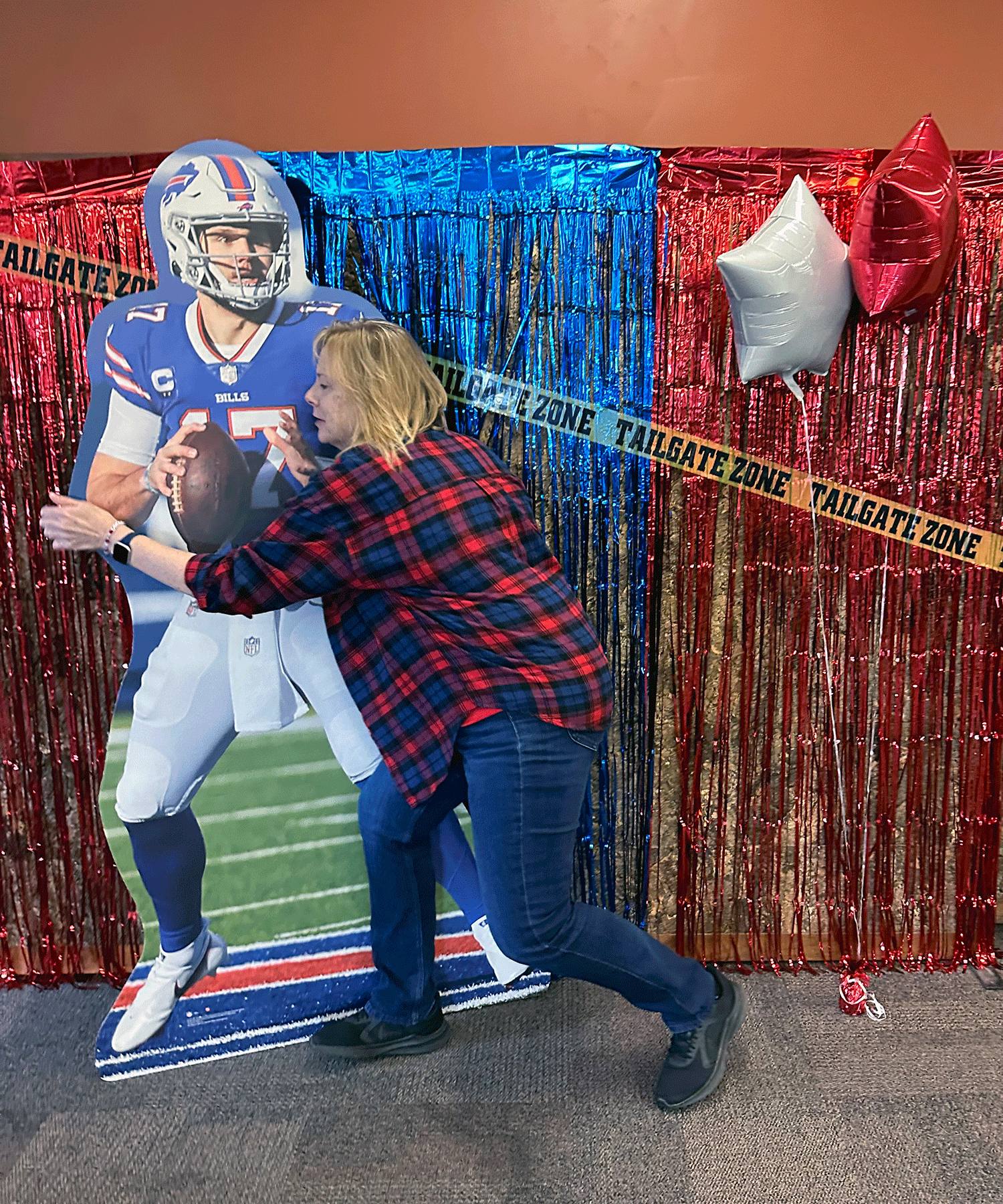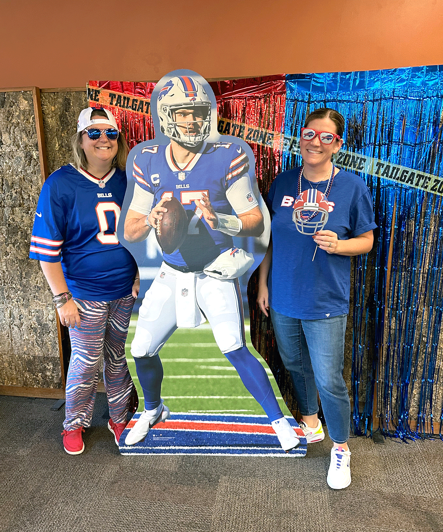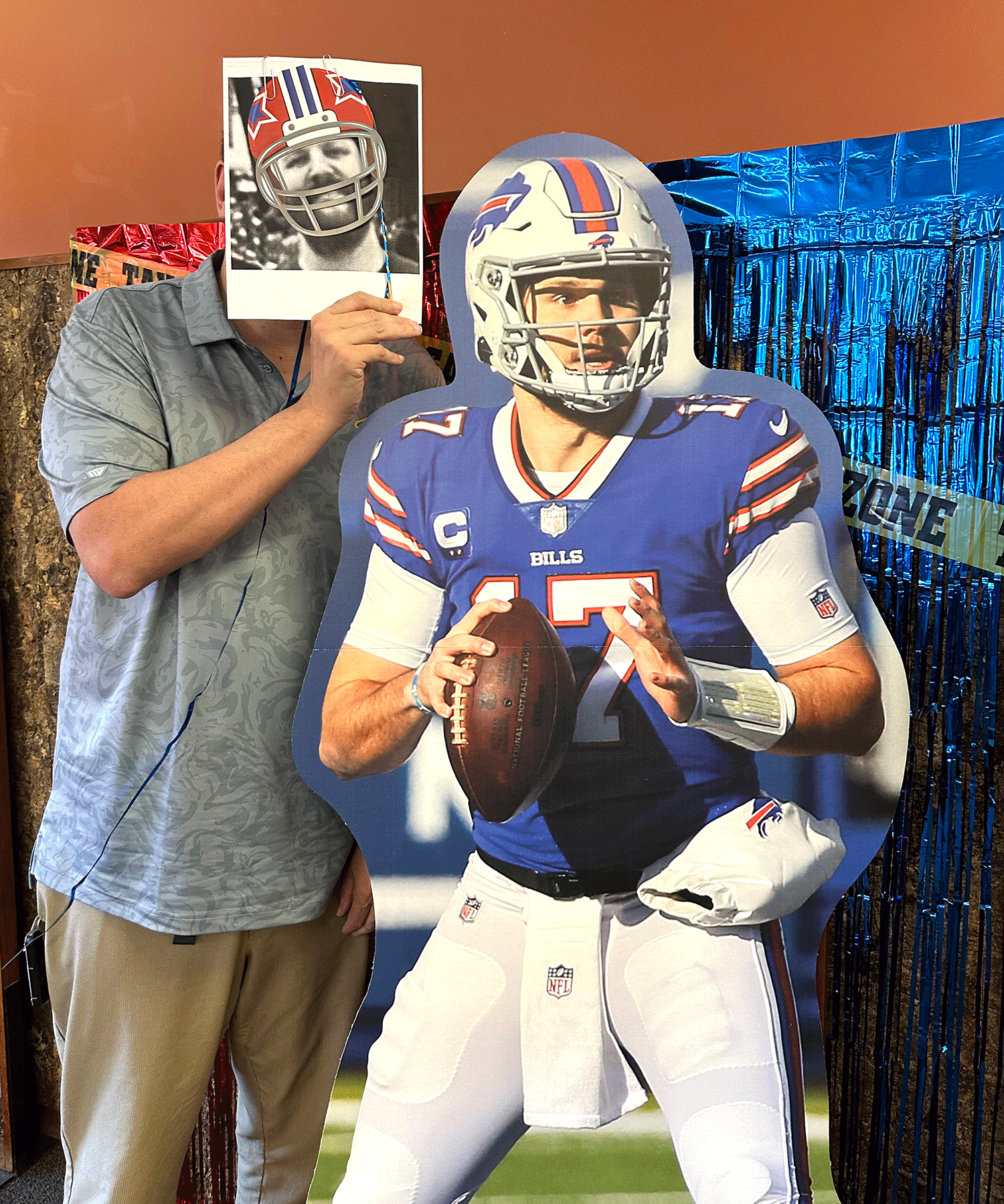 Colleagues snapped photos at the Bills-themed photo booth, complete with props and a cardboard Josh Allen!
