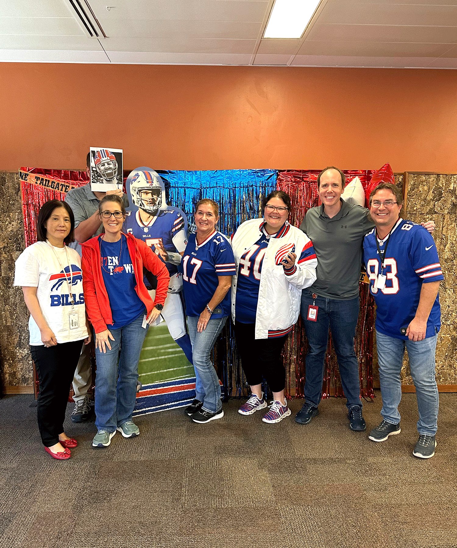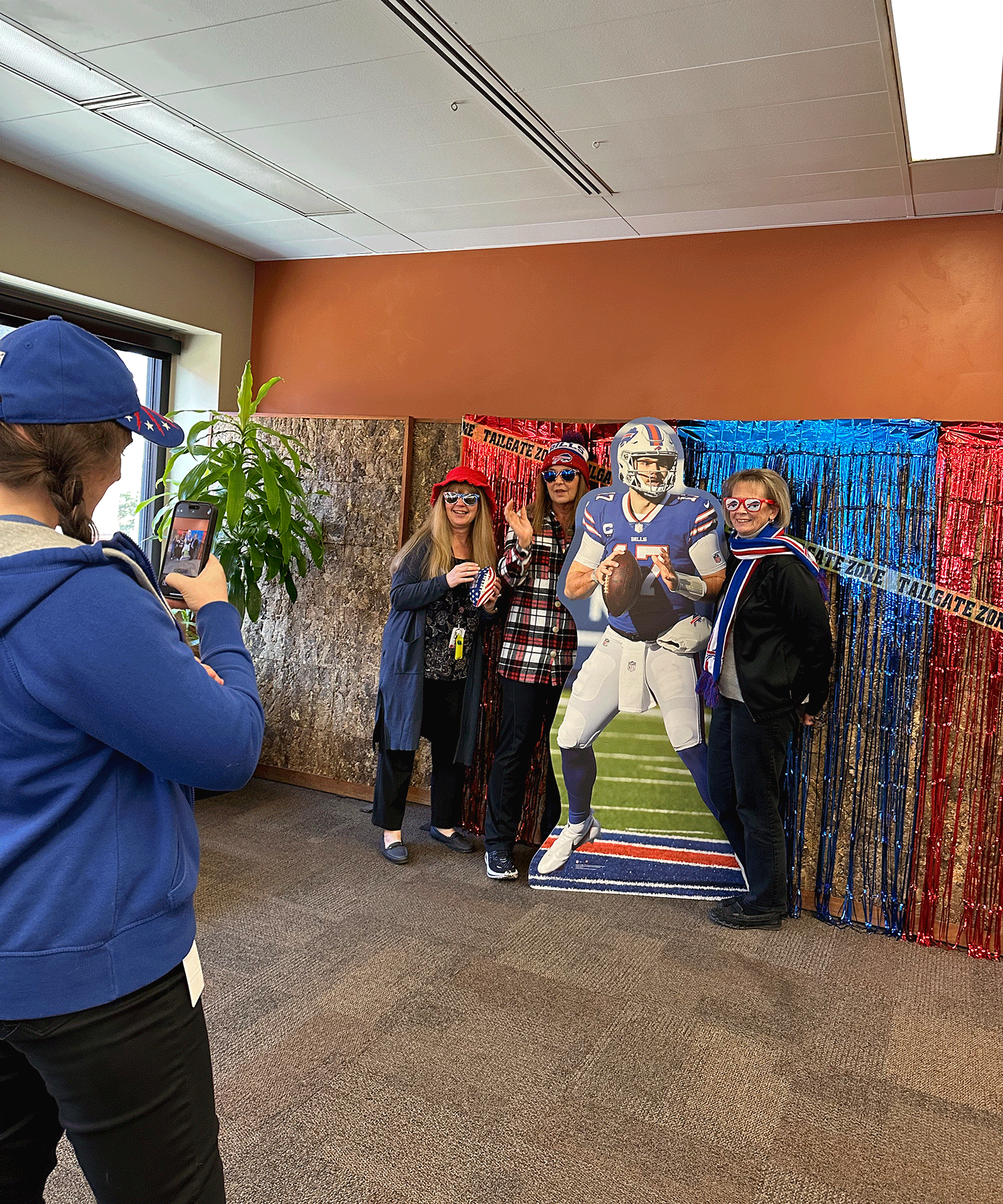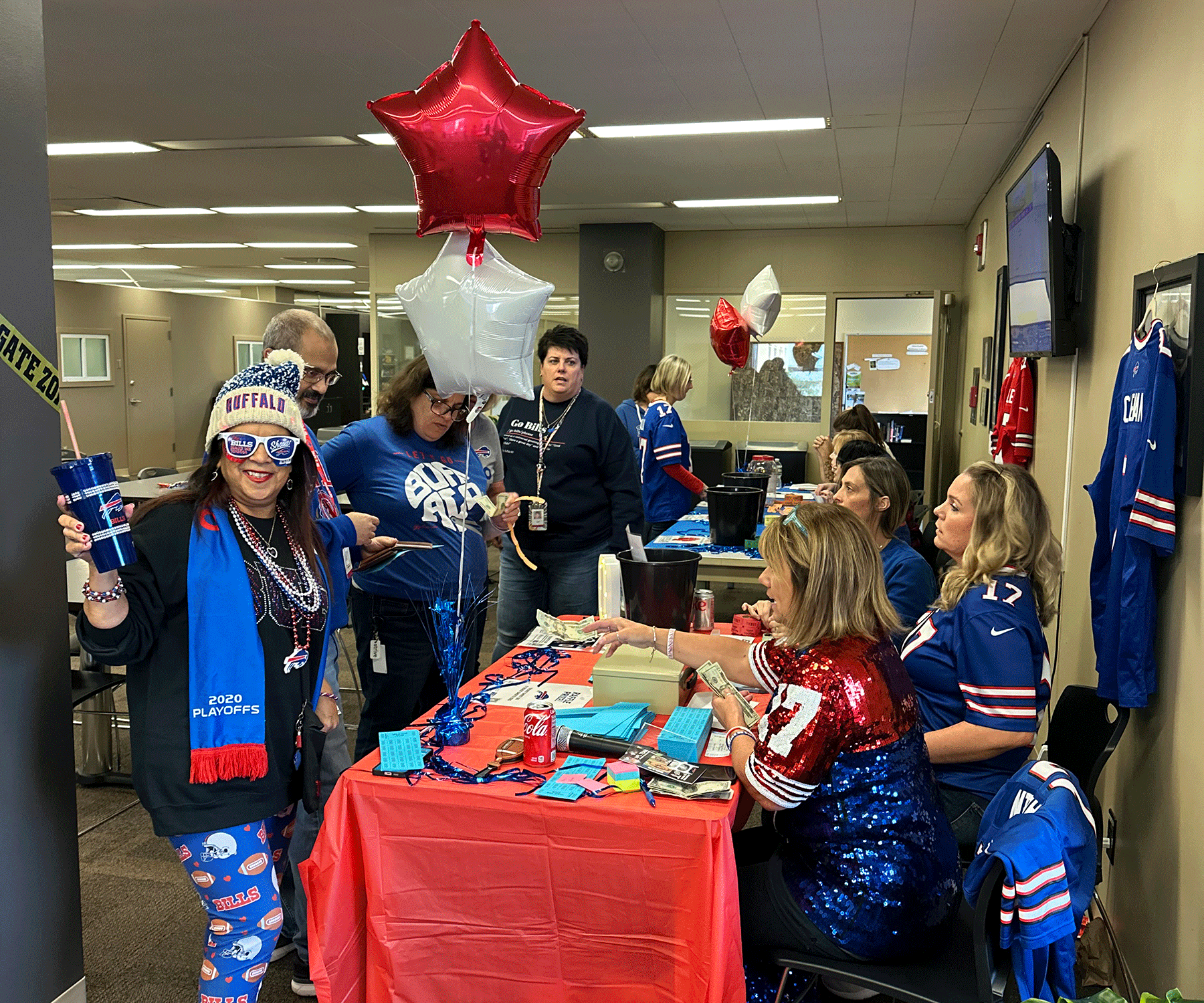 The breakroom was full of blue, white, and red as colleagues came decked out in their Bills best.