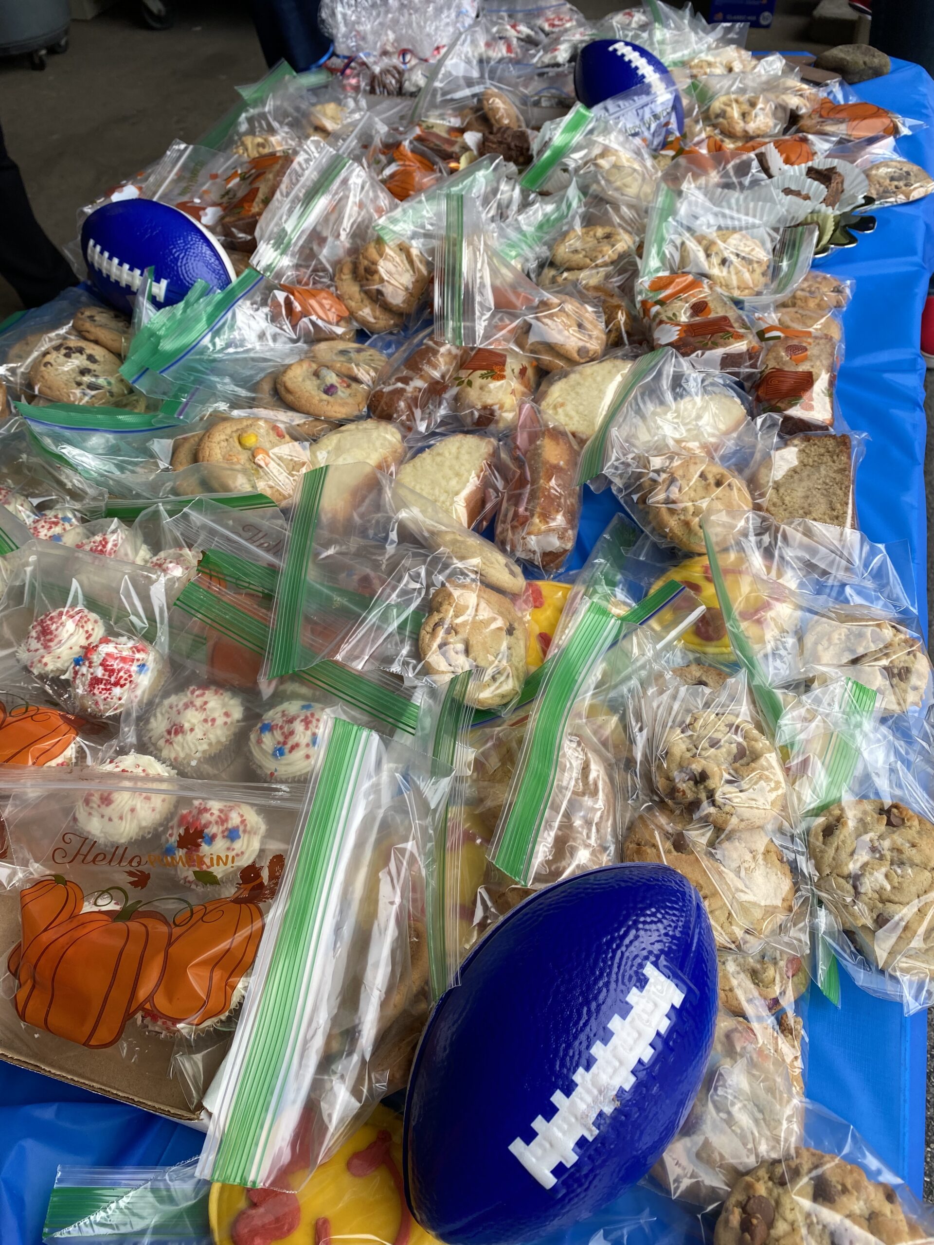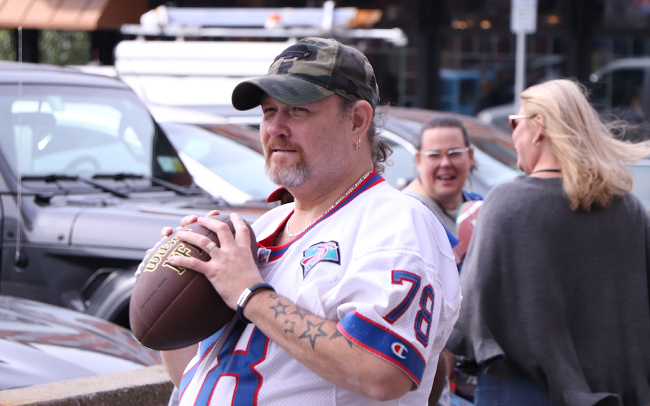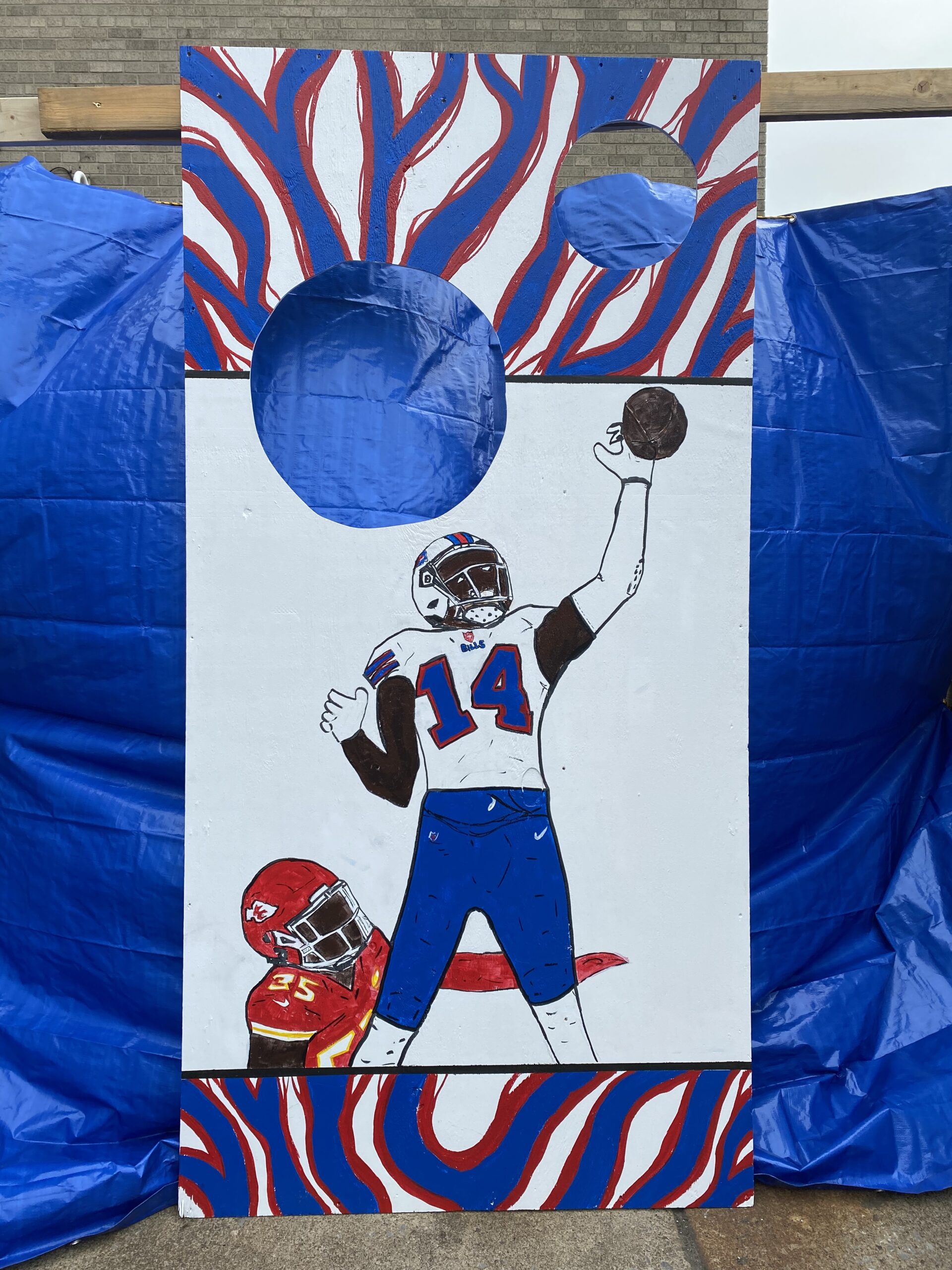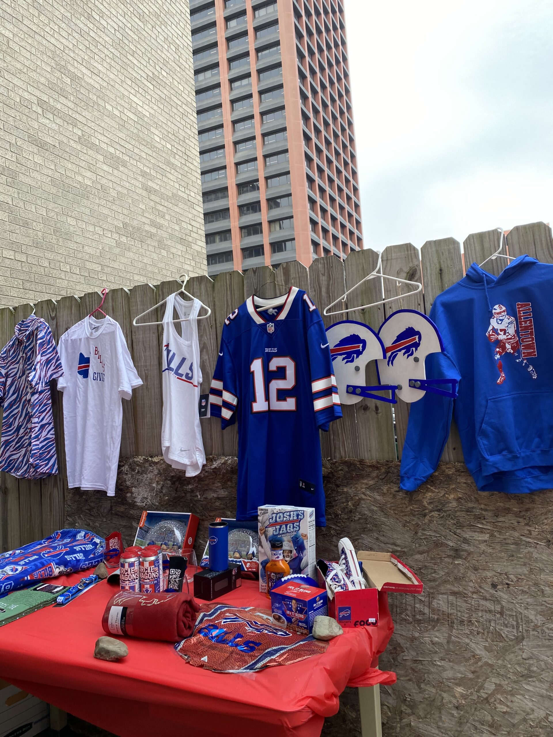 Events included a 50/50 raffle, a raffle table full of Bills merchandise, football throwing competitions, cornhole, and a tailgate lunch of burgers and hotdogs.